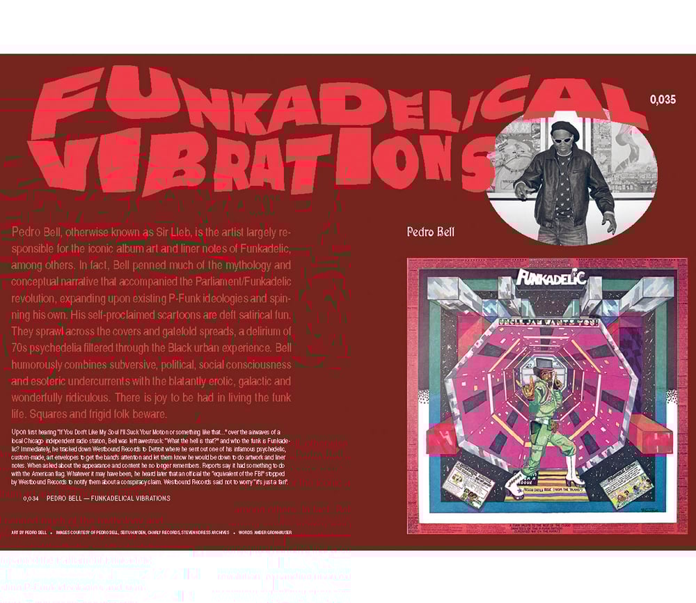 Pedro Bell, otherwise known as Sir Lleb, is the artist largely responsible for the iconic album art and liner notes of Funkadelic, among others. In fact, Bell penned much of the mythology and conceptual narrative that accompanied the Parliament/Funkadelic revolution, expanding upon existing P-Funk ideologies and spinning his own. His self-proclaimed scartoons are deft satirical fun. They sprawl across the covers and gatefold spreads, a delirium of 70s psychedelia filtered through the Black urban experience. Bell humorously combines subversive, political, social consciousness and esoteric undercurrents with the blatantly erotic, galactic and wonderfully ridiculous. There is joy to be had in living the funk life. Squares and frigid folk beware.